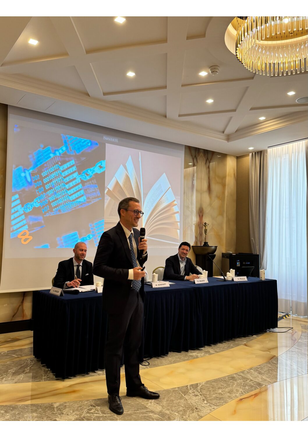 Il moderatore Leonardo PARIGI (Osservatorio ARTICO), ha successivamente introdotto l’incontro evidenziando che il tema principale dell’evento è il mare, trattato non solo come risorsa tradizionale, ma anche come fonte di innovazione. Ha sottolineato l’importanza del mare per Genova, la Liguria, l’Italia e il Mediterraneo, menzionando le nuove normative internazionali che stanno influenzando il settore dei traffici marittimi. Ha poi presentato i relatori della giornata e ha passato la parola ad Andrea Frulla per introdurre il tema della blockchain, chiedendogli di spiegare come questa tecnologia possa essere usata nel settore marittimo e nella produzione di energia dal mare.