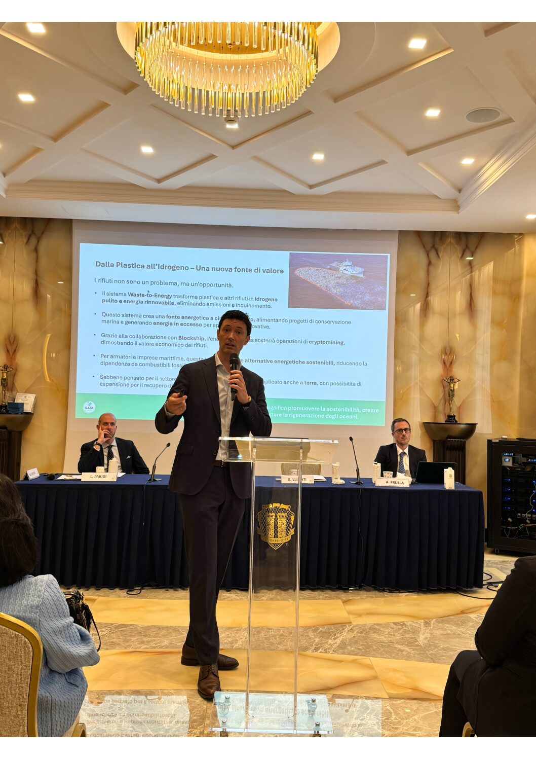 Tra le innovazioni principali dell’organizzazione, il relatore ha presentato un progetto sviluppato con grandi aziende per trasformare i rifiuti plastici (anche non riciclabili) in elementi puri come idrogeno, carbonio e ossigeno, da cui si può generare energia pulita, senza scarti tossici.